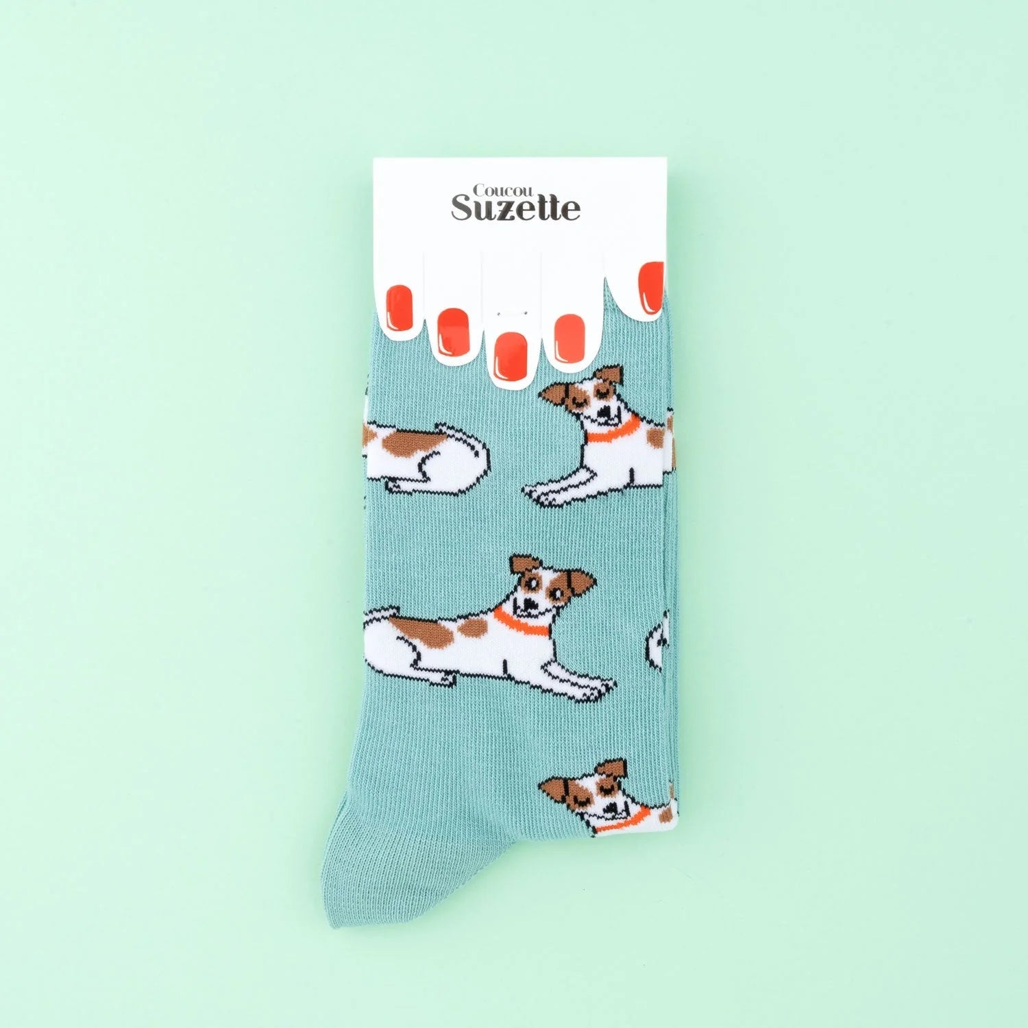 Soft and cozy cotton socks, covered in Jack Russel terriers. One size.